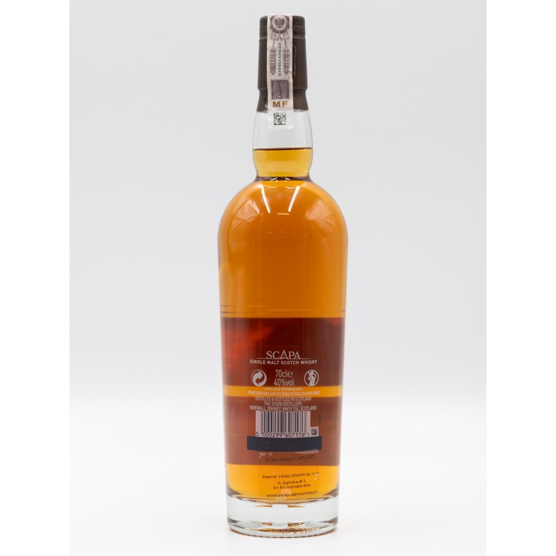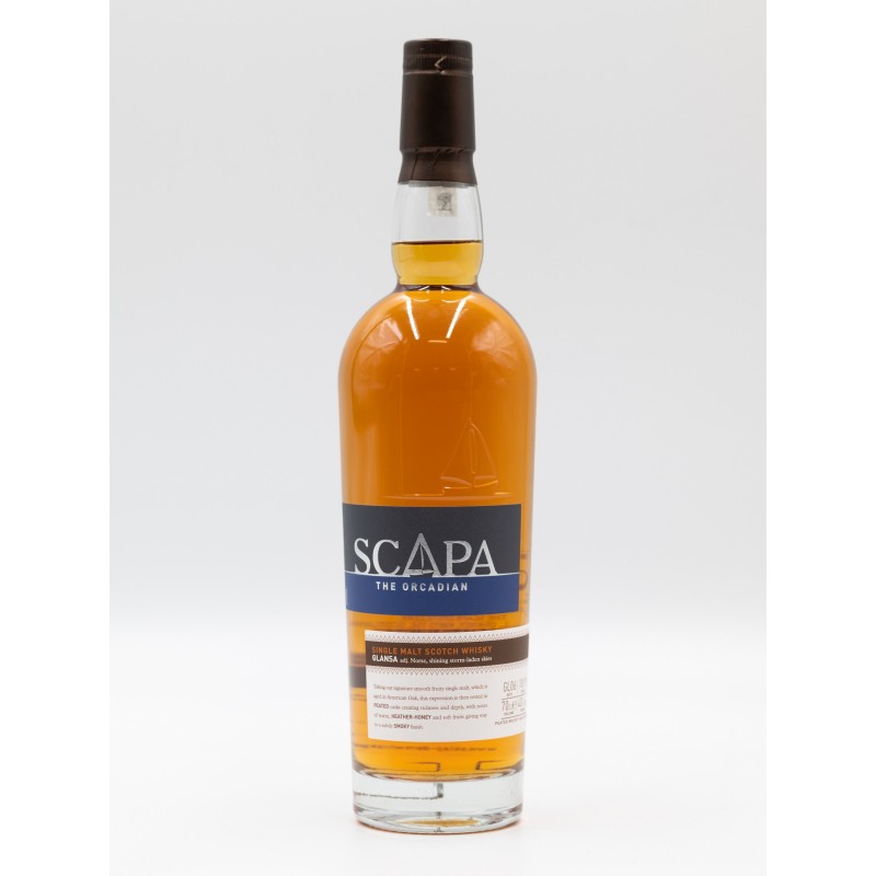 Scapa Glansa jest delikatnym wprowadzeniem do świata torfowych whisky. Barwa złota. Zapach owocowy, słodkie nuty miękkich brzoskwiń, ananasa, wanilii przemieszane z subtelnym dymem z ogniska. Smak brzoskwini, kremowego toffi, karmelu i wanilii, doskonale zrównoważony miękkim dymem. Finisz bardzo długi z wyraźnie dymnym wykończeniem.